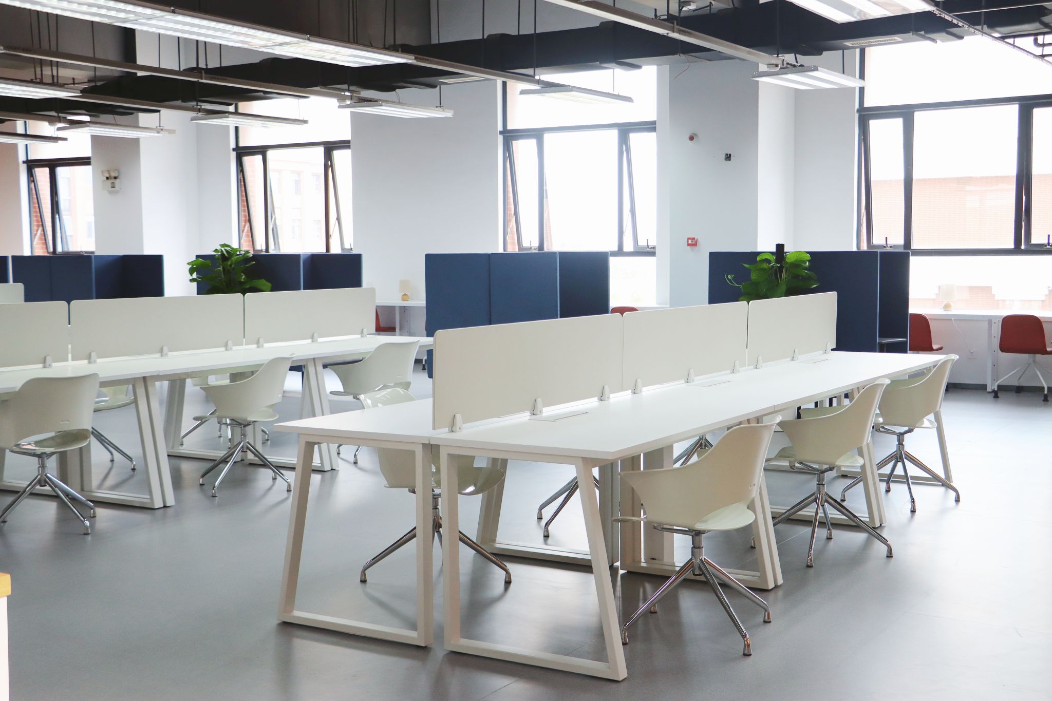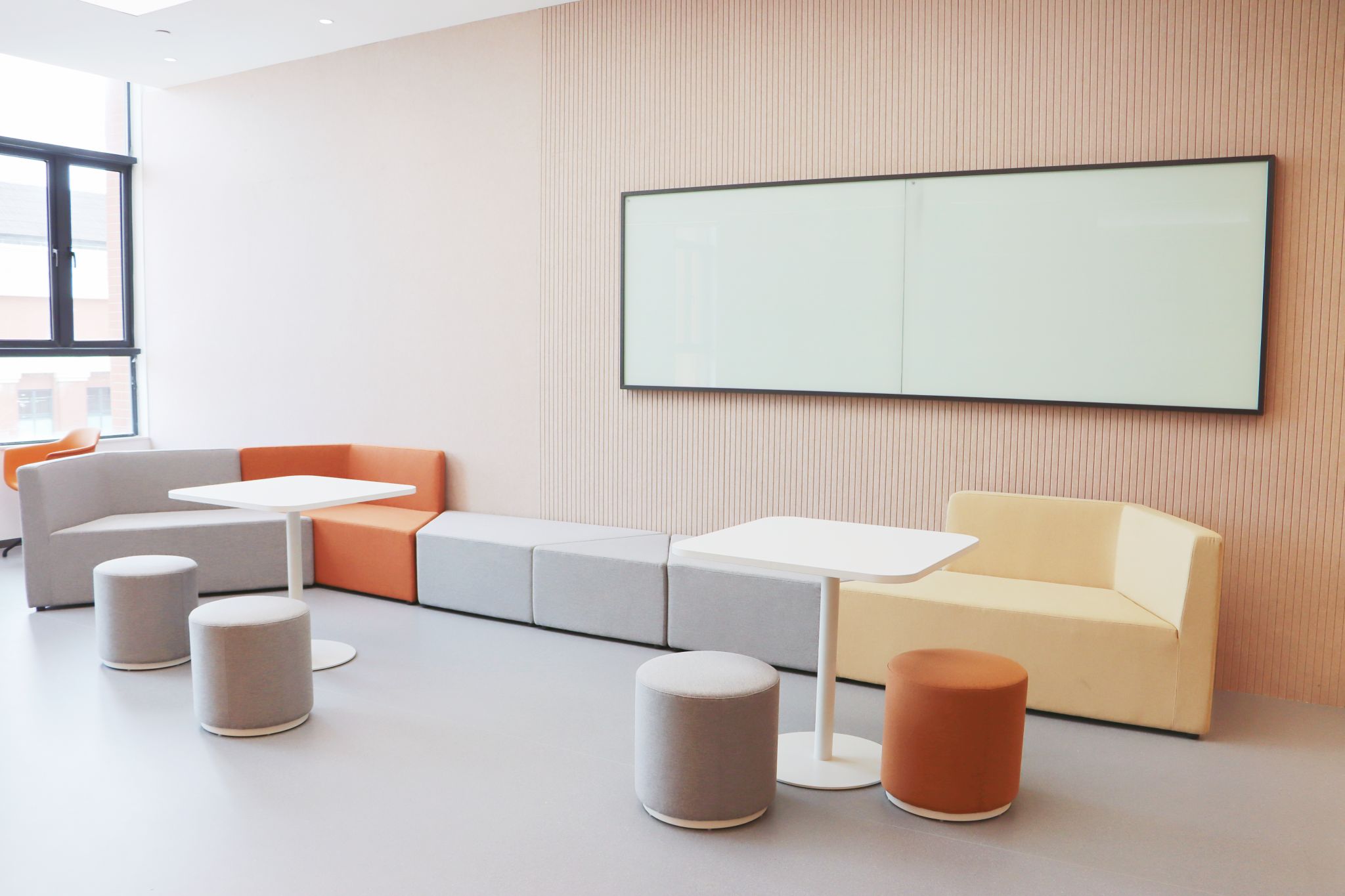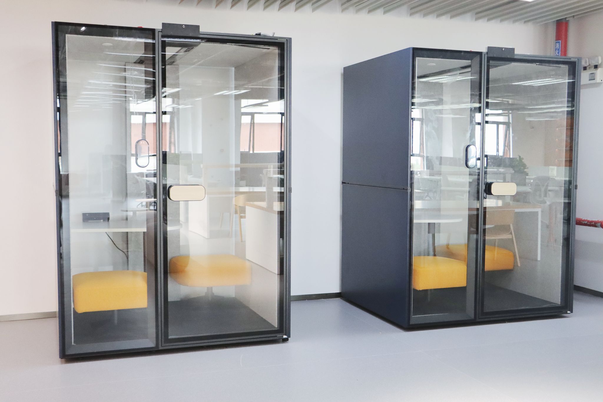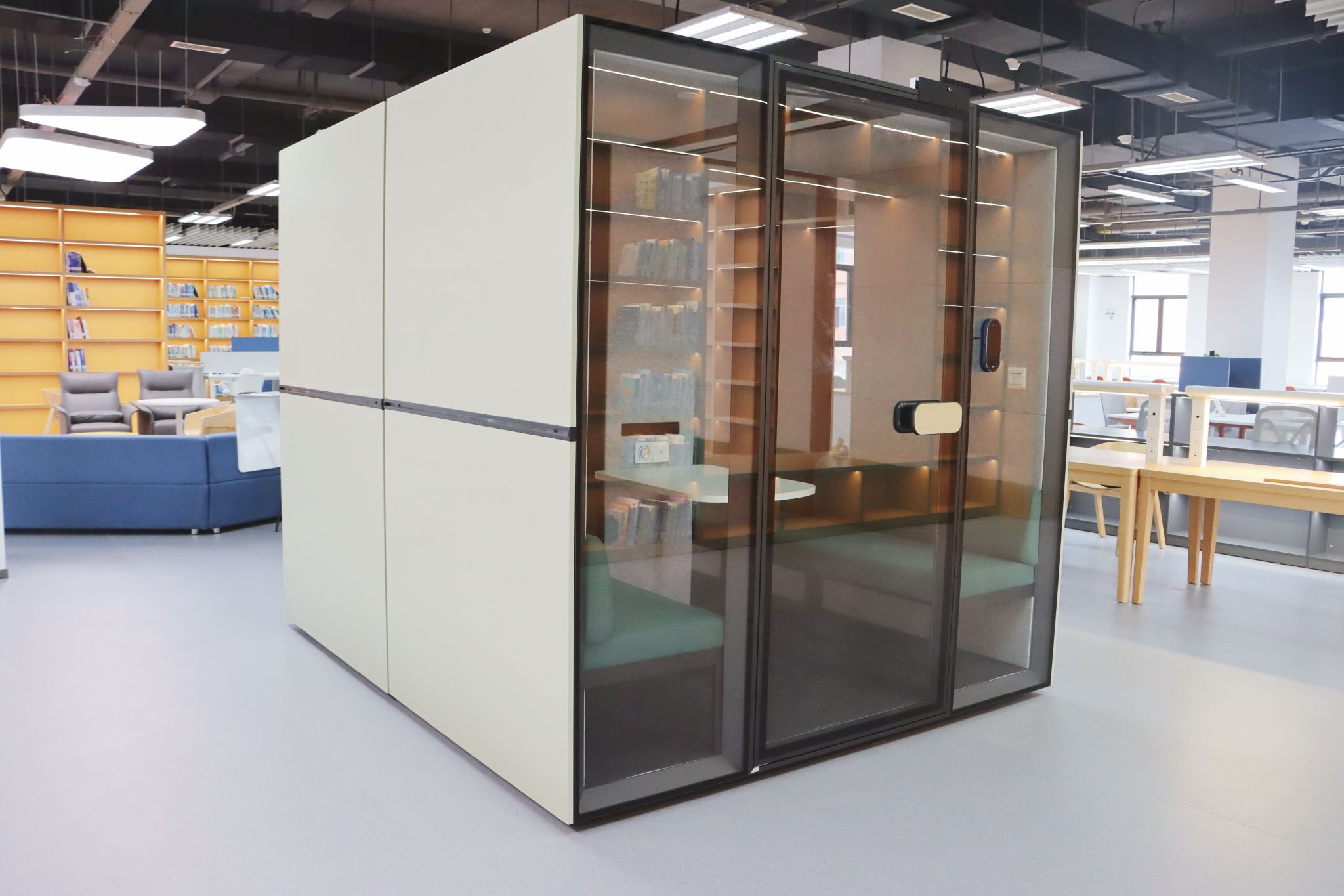 静音舱。共设六个独立静音舱,双人、四人和六人舱各二,设计现代、色彩明快。每个舱体配备独立通风系统、可调节暖光灯及多功能充电面板,隔音效果良好,适合小型团队讨论、视频会议等。
