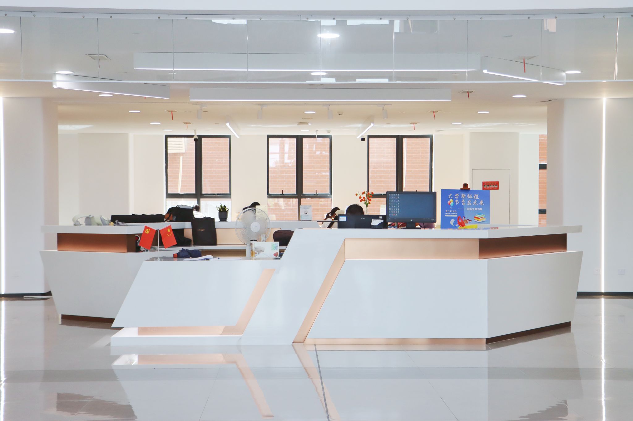 中央咨询服务台。集图书借还、读者咨询、空间导览等服务于一体,提供便捷高效的“一站式”读者服务。服务台周边设有主题书展,展区不定期更新图书内容,轮换展示主题。