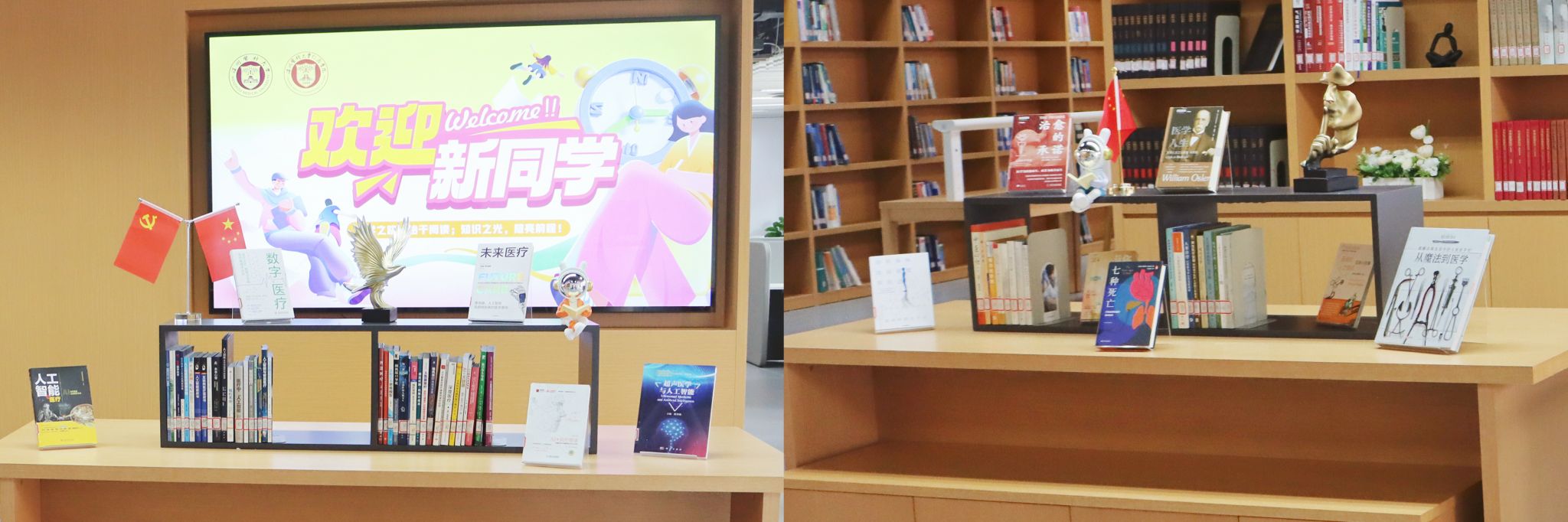 北区入口处展陈“触碰温度、阅见仁心”与“遇见AI,阅见未来”主题书展,从人文伦理与技术创新维度,揭示医学的广度与未来。书展后侧三层矮柜书架,陈列新到馆的医学新书,方便读者第一时间阅览学科最新动态与研究成果。