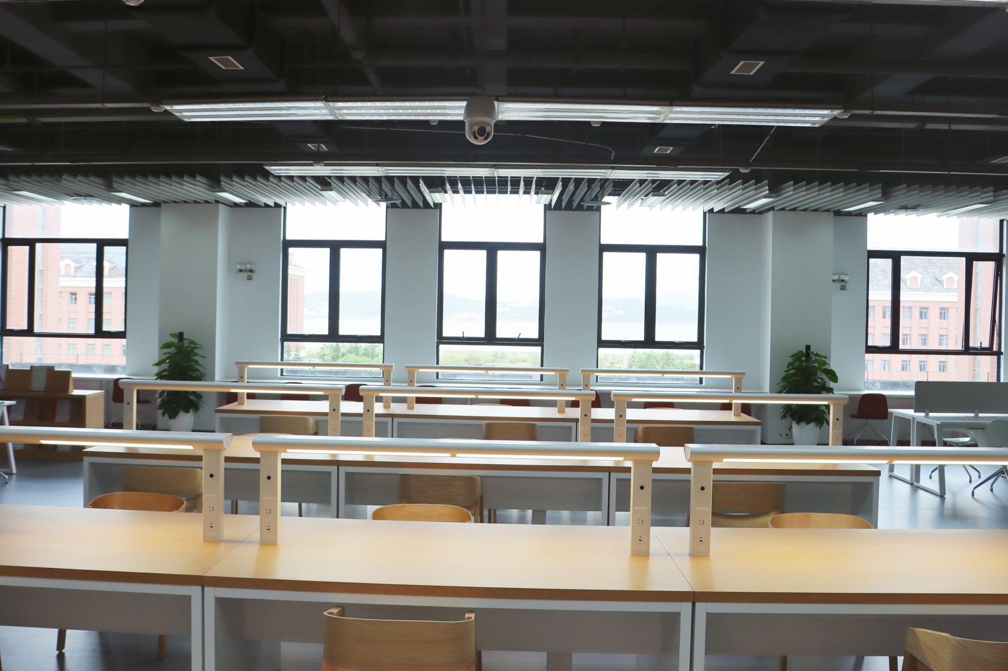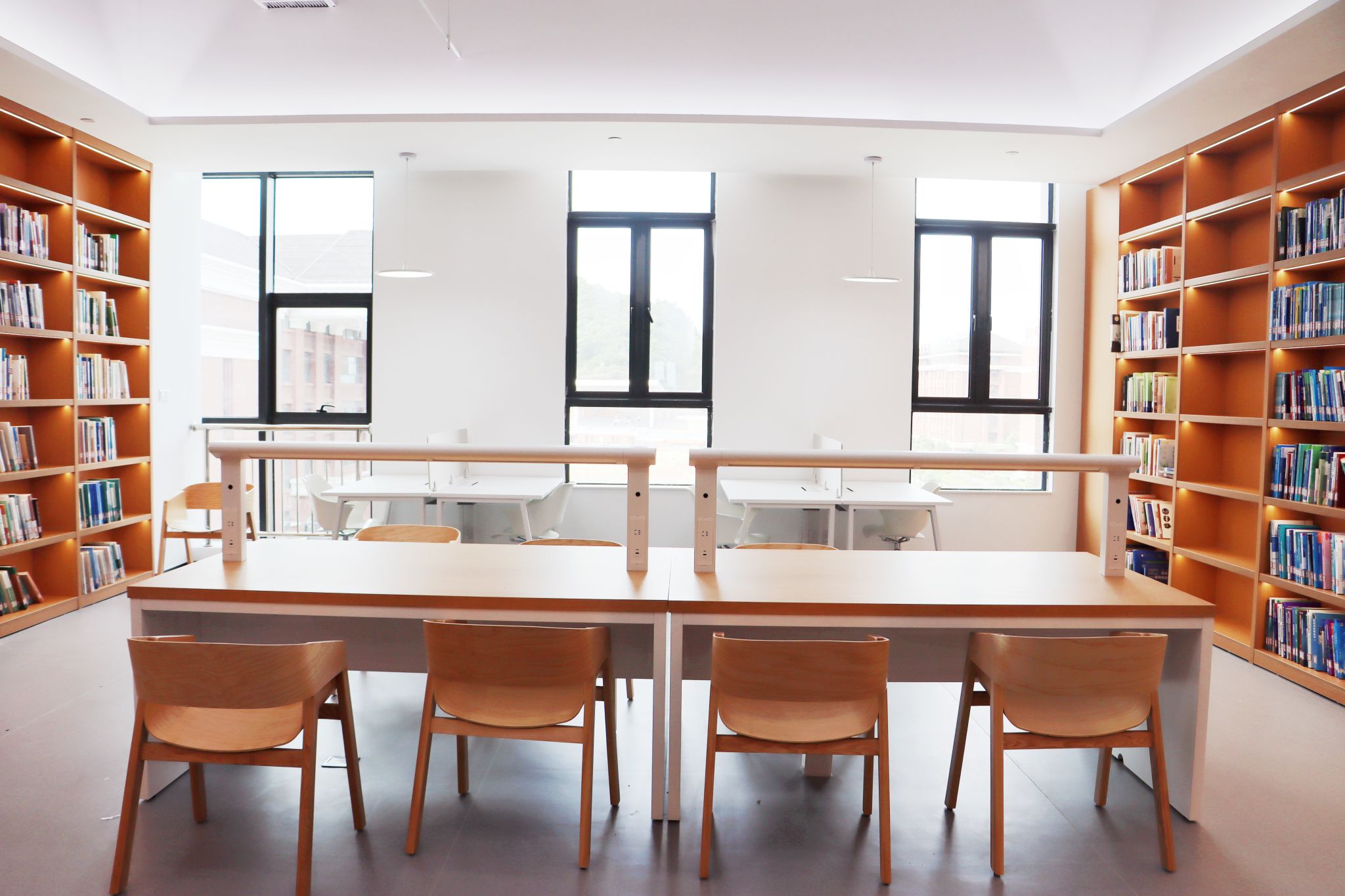 研习阅览区。开阔明亮,规整有序,配备护眼灯和插座,为师生长时间阅读学习保驾护航。