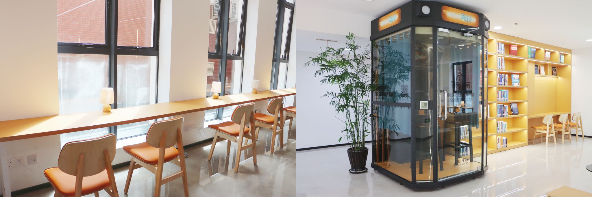 休闲阅读区。巧妙利用自然采光,设有靠窗座位、嵌入式书架与舒适沙发等,辅以柔和灯光和绿植点缀,氛围温馨宁静、轻松惬意。两侧的医大朗读亭配备专业隔音环境与高保真录音设备,提供丰富朗读资源及名家示范,可沉浸式享受声音创作体验。