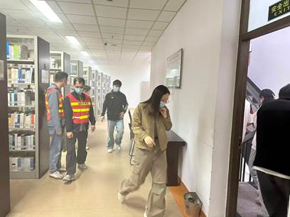 图书馆工作人员听到警报后迅速奔赴各楼层,从外馆七层和内馆五层开始,逐层向下组织疏散。工作人员一边吹响哨子,一边高声提醒:“发生火情,请靠楼梯右侧有序撤离!”学生们按照引导,低头弯腰、捂住口鼻,快速沿楼梯向下跑去。与此同时,安全保卫部接警后火速派出行动灭火组赶赴现场。队员冲向消防栓,迅速展开水带、连接接口出水灭火,进一步压制火势。