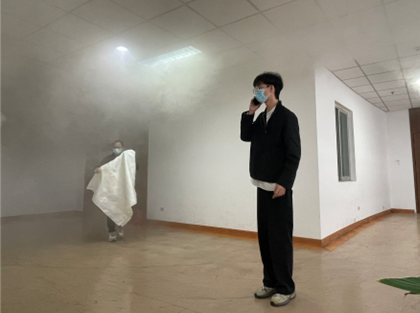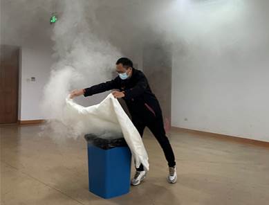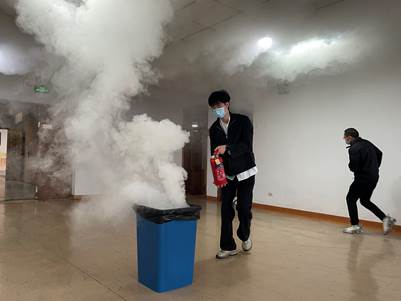 演习伊始,随着烟雾释放装置启动,浓烟迅速在馆内弥漫?!巴际楣?层外馆大厅发生火情,请求支援!”图书馆杨老师发现垃圾桶着火后立即拨打安全保卫部报警电话,并与同行的万老师一起使用灭火器、灭火毯进行扑救。